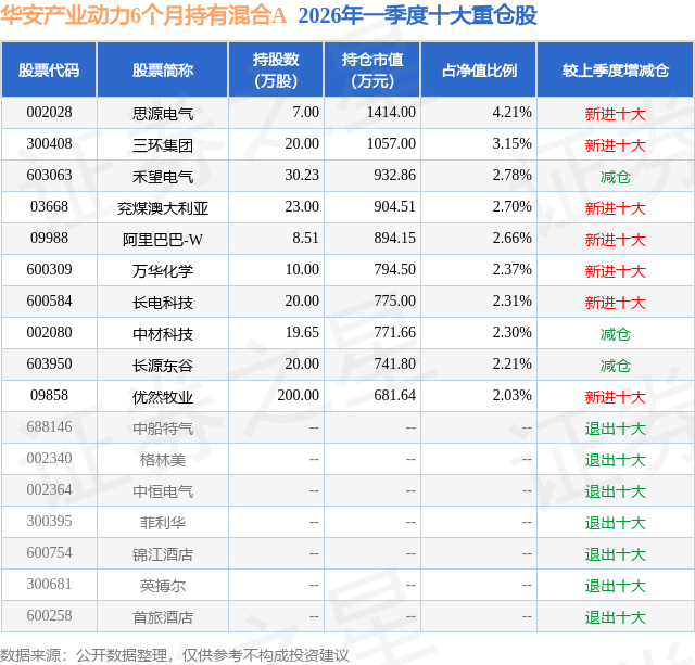 从基金规模来看,华安产业动力6个月持有混合A基金2026年一季度公布的基金规模为3.09亿元,较上一期规模3.61亿元变化了-5199.68万元,环比变化了-14.42%。该基金最新一期资产配置为:股票占净值比89.78%,无债券类资产,现金占净值比9.51%。从基金持仓来看,该基金当季前十大股票仓位达26.72%,第一大重仓股为思源电气(002028),持仓占比为4.21%。