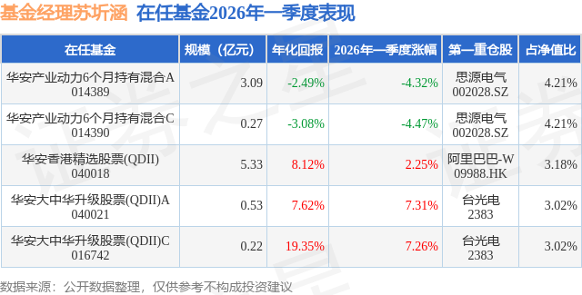 华安产业动力6个月持有混合A现任基金经理为苏圻涵,本季度增聘基金经理苏圻涵,近期离任的基金经理为蒋璆。其中在任基金经理苏圻涵已从业19年又177天,2026年1月19日正式接手管理华安产业动力6个月持有混合A,任职期间累计回报为4.0%。目前还管理着5只基金产品(包括A类和C类),其中本季度表现最佳的基金为华安大中华升级股票(QDII)A(040021),季度净值涨幅为7.31%。