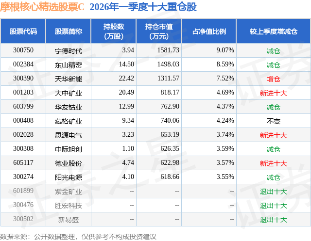 从基金规模来看,摩根核心精选股票C基金2026年一季度公布的基金规模为0.05亿元,较上一期规模547.12万元变化了-30.34万元,环比变化了-5.55%。该基金最新一期资产配置为:股票占净值比93.86%,无债券类资产,现金占净值比6.24%。从基金持仓来看,该基金当季前十大股票仓位达52.93%,第一大重仓股为宁德时代(300750),持仓占比为9.07%。