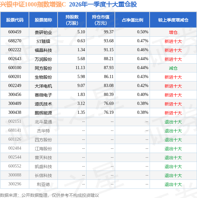 从基金规模来看,兴银中证1000指数增强C基金2026年一季度公布的基金规模为1.29亿元,较上一期规模1.29亿元变化了42.0万元,环比变化了0.33%。该基金最新一期资产配置为:股票占净值比91.61%,债券占净值比0.15%,现金占净值比7.75%。从基金持仓来看,该基金当季前十大股票仓位达4.32%,第一大重仓股为贵研铂业(600459),持仓占比为0.5%。