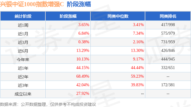 从业绩表现来看,兴银中证1000指数增强C基金过去一年净值涨幅为44.15%,在同类基金中排名332/651,同类基金过去一年净值涨幅中位数为44.44%。而基金过去一年的最大回撤为-13.56%,成立以来的最大回撤为-39.23%。