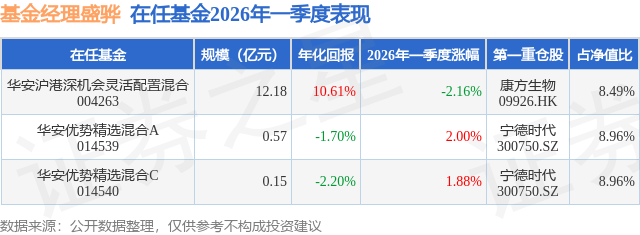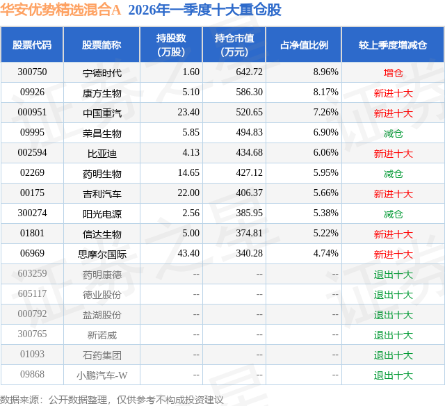 从基金规模来看,华安优势精选混合A基金2026年一季度公布的基金规模为0.57亿元,较上一期规模5722.59万元变化了-30.28万元,环比变化了-0.53%。该基金最新一期资产配置为:股票占净值比93.46%,无债券类资产,现金占净值比6.91%。从基金持仓来看,该基金当季前十大股票仓位达64.3%,第一大重仓股为宁德时代(300750),持仓占比为8.96%。