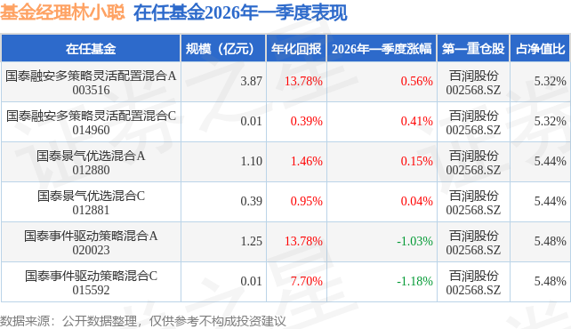 从基金规模来看,国泰融安多策略灵活配置混合C基金2026年一季度公布的基金规模为0.01亿元,较上一期规模119.17万元变化了4.08万元,环比变化了3.42%。该基金最新一期资产配置为:股票占净值比79.83%,债券占净值比6.14%,现金占净值比13.31%。从基金持仓来看,该基金当季前十大股票仓位达21.77%,第一大重仓股为百润股份(002568),持仓占比为5.32%。