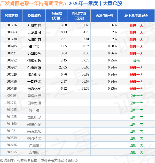 从基金规模来看,广发睿恒进取一年持有期混合A基金2026年一季度公布的基金规模为0.83亿元,较上一期规模1.53亿元变化了-6928.25万元,环比变化了-45.42%。该基金最新一期资产配置为:股票占净值比91.55%,债券占净值比0.44%,现金占净值比11.08%。从基金持仓来看,该基金当季前十大股票仓位达9.74%,第一大重仓股为万凯新材(301216),持仓占比为1.06%。