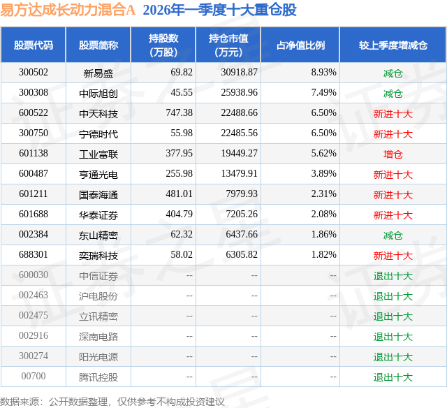 从基金规模来看,易方达成长动力混合A基金2026年一季度公布的基金规模为20.92亿元,较上一期规模3.38亿元变化了17.54亿元,环比变化了519.43%。该基金最新一期资产配置为:股票占净值比83.16%,无债券类资产,现金占净值比16.38%。从基金持仓来看,该基金当季前十大股票仓位达47.0%,第一大重仓股为新易盛(300502),持仓占比为8.93%。