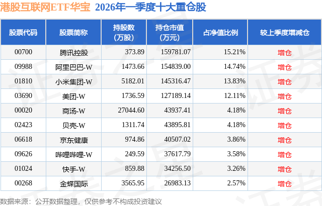 从基金规模来看,港股互联网ETF华宝基金2026年一季度公布的基金规模为105.05亿元,较上一期规模123.43亿元变化了-18.38亿元,环比变化了-14.89%。该基金最新一期资产配置为:股票占净值比99.68%,无债券类资产,现金占净值比0.41%。从基金持仓来看,该基金当季前十大股票仓位达77.52%,第一大重仓股为腾讯控股(00700),持仓占比为15.21%。