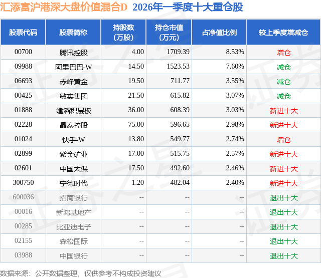 从基金规模来看,汇添富沪港深大盘价值混合D基金2026年一季度公布的基金规模为0.0亿元,较上一期规模13.14万元变化了9.85万元,环比变化了74.95%。该基金最新一期资产配置为:股票占净值比93.44%,无债券类资产,现金占净值比5.84%。从基金持仓来看,该基金当季前十大股票仓位达38.93%,第一大重仓股为腾讯控股(00700),持仓占比为8.53%。