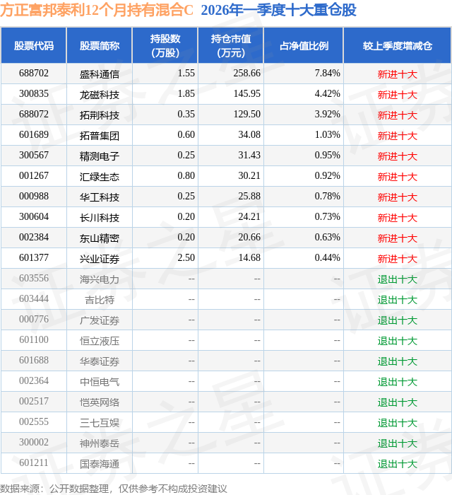 从基金规模来看,方正富邦泰利12个月持有混合C基金2026年一季度公布的基金规模为0.01亿元,较上一期规模120.64万元变化了-8.87万元,环比变化了-7.35%。该基金最新一期资产配置为:股票占净值比21.67%,债券占净值比73.14%,现金占净值比6.16%。从基金持仓来看,该基金当季前十大股票仓位达21.66%,第一大重仓股为盛科通信(688702),持仓占比为7.84%。