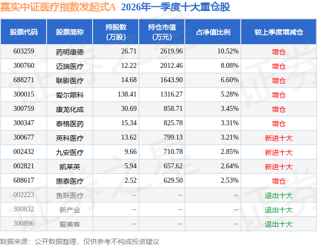 从基金规模来看,嘉实中证医疗指数发起式A基金2026年一季度公布的基金规模为0.6亿元,较上一期规模3194.95万元变化了2803.22万元,环比变化了87.74%。该基金最新一期资产配置为:股票占净值比94.64%,无债券类资产,现金占净值比6.02%。从基金持仓来看,该基金当季前十大股票仓位达48.47%,第一大重仓股为药明康德(603259),持仓占比为10.52%。