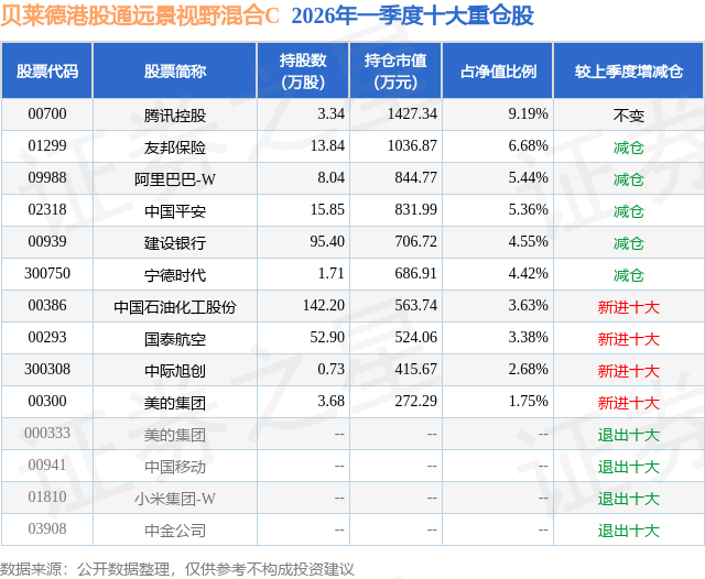 从基金规模来看,贝莱德港股通远景视野混合C基金2026年一季度公布的基金规模为0.56亿元,较上一期规模8130.86万元变化了-2513.68万元,环比变化了-30.92%。该基金最新一期资产配置为:股票占净值比92.82%,债券占净值比1.5%,现金占净值比4.85%。从基金持仓来看,该基金当季前十大股票仓位达47.08%,第一大重仓股为腾讯控股(00700),持仓占比为9.19%。