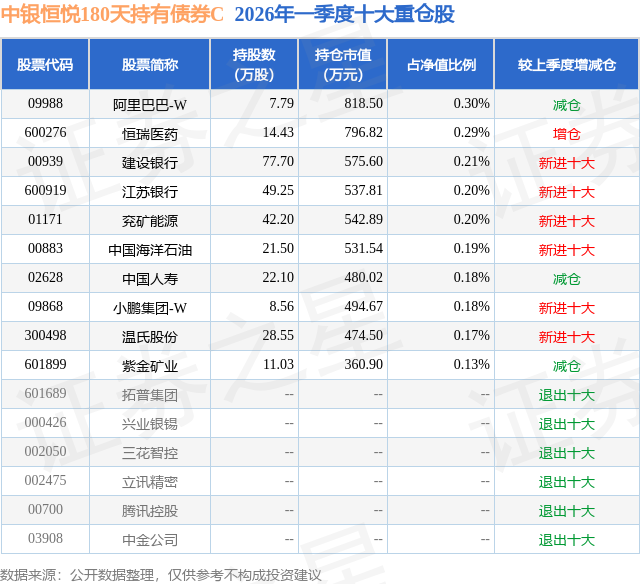 从基金规模来看,中银恒悦180天持有债券C基金2026年一季度公布的基金规模为8.35亿元,较上一期规模3.05亿元变化了5.3亿元,环比变化了173.8%。该基金最新一期资产配置为:股票占净值比4.47%,债券占净值比97.09%,现金占净值比0.76%。从基金持仓来看,该基金当季前十大股票仓位达2.05%,第一大重仓股为阿里巴巴-W(09988),持仓占比为0.3%。
