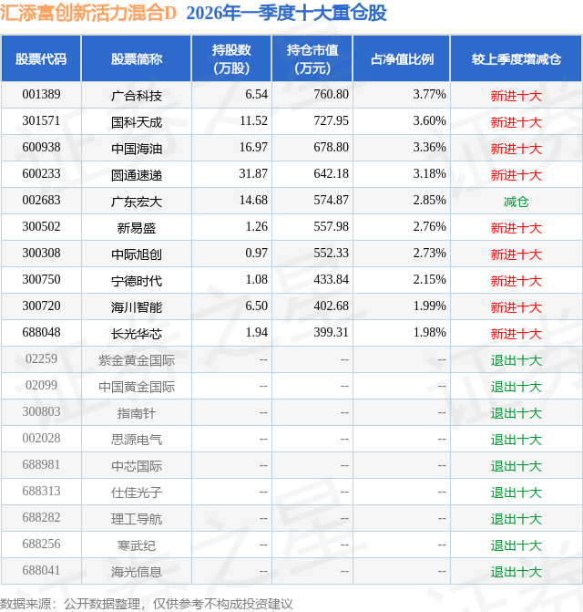 从基金规模来看,汇添富创新活力混合D基金2026年一季度公布的基金规模为0.18亿元,较上一期规模19.5万元变化了1783.81万元,环比变化了9148.16%。该基金最新一期资产配置为:股票占净值比83.82%,无债券类资产,现金占净值比21.22%。从基金持仓来看,该基金当季前十大股票仓位达28.37%,第一大重仓股为广合科技(001389),持仓占比为3.77%。