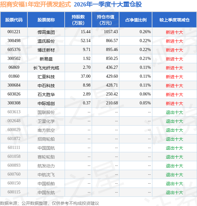 从基金规模来看,招商安福1年定开债发起式基金2026年一季度公布的基金规模为40.06亿元,较上一期规模43.11亿元变化了-3.05亿元,环比变化了-7.08%。该基金最新一期资产配置为:股票占净值比1.35%,债券占净值比101.61%,现金占净值比0.63%。从基金持仓来看,该基金当季前十大股票仓位达1.35%,第一大重仓股为悍高集团(001221),持仓占比为0.26%。