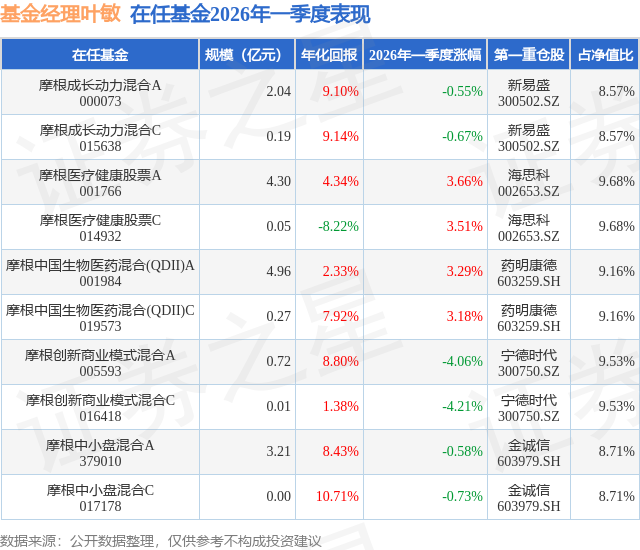证券之星消息,日前摩根医疗健康股票C基金公布一季报,2026年一季度最新规模0.05亿元,季度净值涨幅为3.51%。
