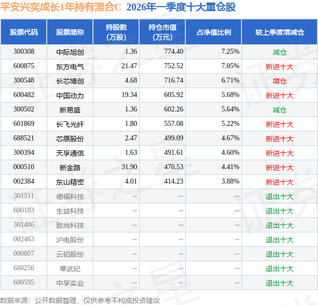 从基金规模来看,平安兴奕成长1年持有混合C基金2026年一季度公布的基金规模为0.21亿元,较上一期规模3537.23万元变化了-1453.84万元,环比变化了-41.1%。该基金最新一期资产配置为:股票占净值比73.87%,债券占净值比0.47%,现金占净值比25.89%。从基金持仓来看,该基金当季前十大股票仓位达55.11%,第一大重仓股为中际旭创(300308),持仓占比为7.25%。