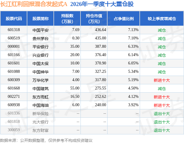 从基金规模来看,长江红利回报混合发起式A基金2026年一季度公布的基金规模为0.55亿元,较上一期规模1.69亿元变化了-1.14亿元,环比变化了-67.27%。该基金最新一期资产配置为:股票占净值比90.43%,无债券类资产,现金占净值比10.87%。从基金持仓来看,该基金当季前十大股票仓位达55.82%,第一大重仓股为中国平安(601318),持仓占比为7.13%。