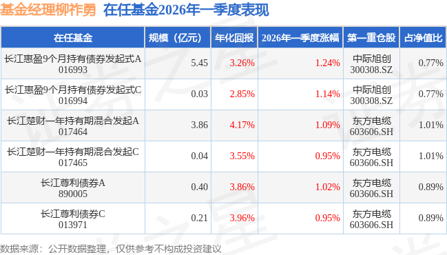 证券之星消息,日前长江尊利债券C基金公布一季报,2026年一季度最新规模0.21亿元,季度净值涨幅为0.95%。