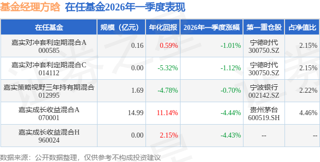 证券之星消息,日前嘉实对冲套利定期混合C基金公布一季报,2026年一季度最新规模0.0亿元,季度净值涨幅为-1.12%。