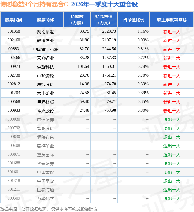 从基金规模来看,博时稳益9个月持有混合C基金2026年一季度公布的基金规模为15.12亿元,较上一期规模1.99亿元变化了13.12亿元,环比变化了658.77%。该基金最新一期资产配置为:股票占净值比9.77%,债券占净值比79.3%,现金占净值比6.1%。从基金持仓来看,该基金当季前十大股票仓位达6.6%,第一大重仓股为湖南裕能(301358),持仓占比为1.16%。