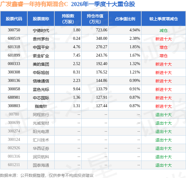 从基金规模来看,广发鑫睿一年持有期混合C基金2026年一季度公布的基金规模为0.45亿元,较上一期规模8695.46万元变化了-4222.2万元,环比变化了-48.56%。该基金最新一期资产配置为:股票占净值比90.82%,债券占净值比0.01%,现金占净值比12.66%。从基金持仓来看,该基金当季前十大股票仓位达17.01%,第一大重仓股为宁德时代(300750),持仓占比为4.94%。