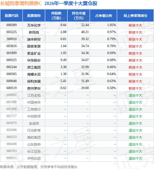 从基金规模来看,长城悦享增利债券C基金2026年一季度公布的基金规模为0.08亿元,较上一期规模1023.58万元变化了-190.44万元,环比变化了-18.61%。该基金最新一期资产配置为:股票占净值比9.44%,债券占净值比82.68%,现金占净值比1.14%。从基金持仓来看,该基金当季前十大股票仓位达7.39%,第一大重仓股为万华化学(600309),持仓占比为1.05%。
