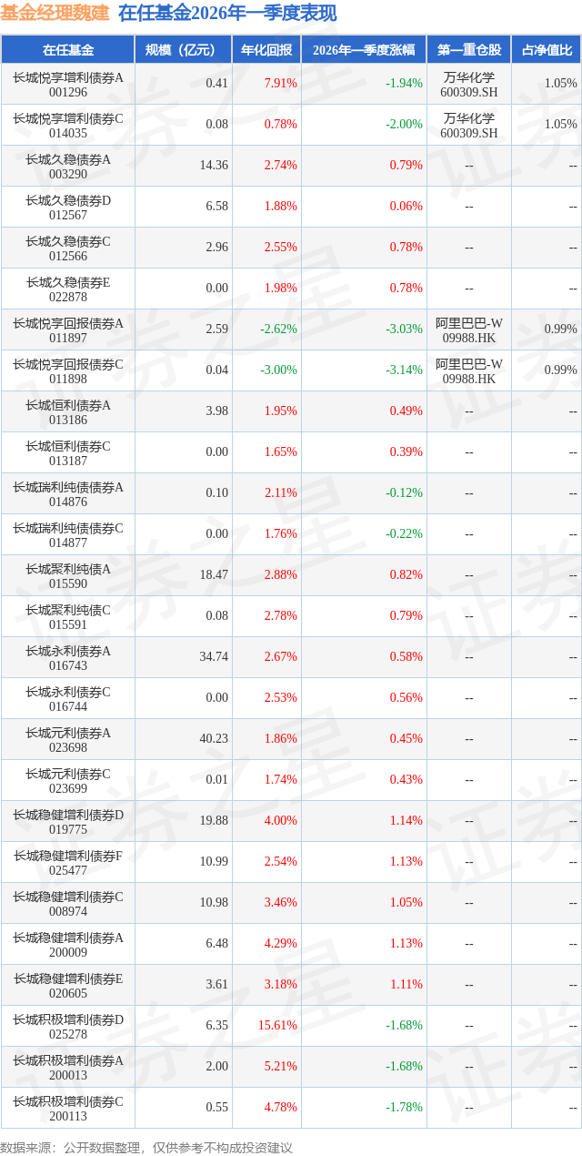 证券之星消息,日前长城悦享增利债券C基金公布一季报,2026年一季度最新规模0.08亿元,季度净值涨幅为-2.0%。