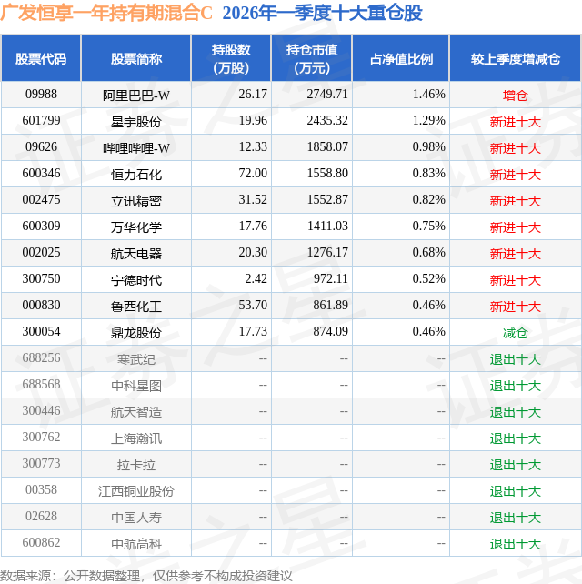 从基金规模来看,广发恒享一年持有期混合C基金2026年一季度公布的基金规模为13.77亿元,较上一期规模2.79亿元变化了10.98亿元,环比变化了393.26%。该基金最新一期资产配置为:股票占净值比16.42%,债券占净值比87.51%,现金占净值比6.92%。从基金持仓来看,该基金当季前十大股票仓位达8.25%,第一大重仓股为阿里巴巴-W(09988),持仓占比为1.46%。