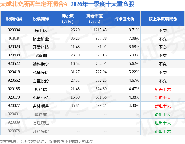从基金规模来看,大成北交所两年定开混合A基金2026年一季度公布的基金规模为1.07亿元,较上一期规模2.55亿元变化了-1.48亿元,环比变化了-57.97%。该基金最新一期资产配置为:股票占净值比87.88%,无债券类资产,现金占净值比12.18%。从基金持仓来看,该基金当季前十大股票仓位达57.06%,第一大重仓股为民士达(920394),持仓占比为8.71%。
