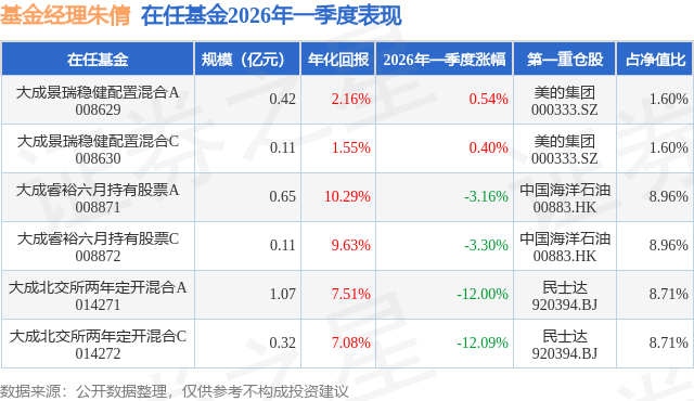 证券之星消息,日前大成北交所两年定开混合A基金公布一季报,2026年一季度最新规模1.07亿元,季度净值涨幅为-12.0%。