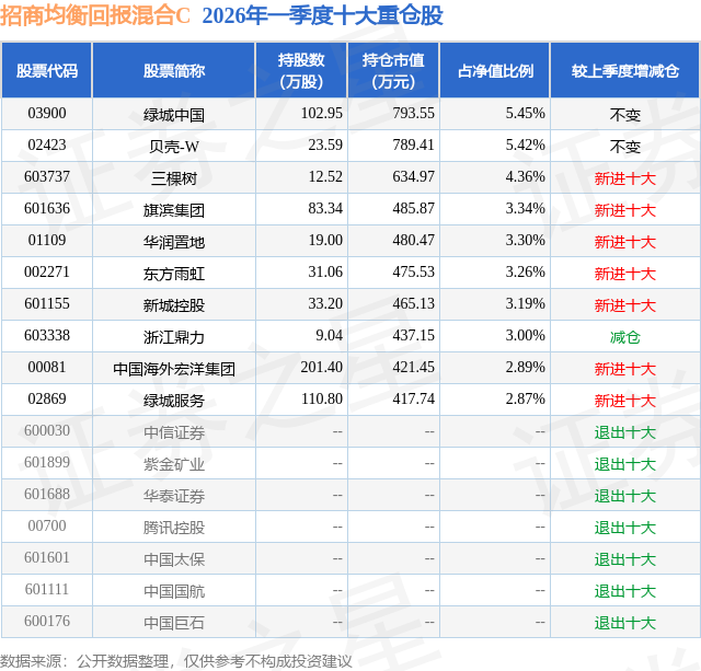 从基金规模来看,招商均衡回报混合C基金2026年一季度公布的基金规模为0.06亿元,较上一期规模997.53万元变化了-421.11万元,环比变化了-42.22%。该基金最新一期资产配置为:股票占净值比86.22%,债券占净值比6.06%,现金占净值比10.35%。从基金持仓来看,该基金当季前十大股票仓位达37.08%,第一大重仓股为绿城中国(03900),持仓占比为5.45%。