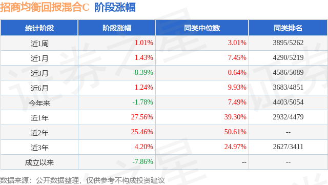 从业绩表现来看,招商均衡回报混合C基金过去一年净值涨幅为27.56%,在同类基金中排名2932/4479,同类基金过去一年净值涨幅中位数为39.3%。而基金过去一年的最大回撤为-16.69%,成立以来的最大回撤为-38.39%。
