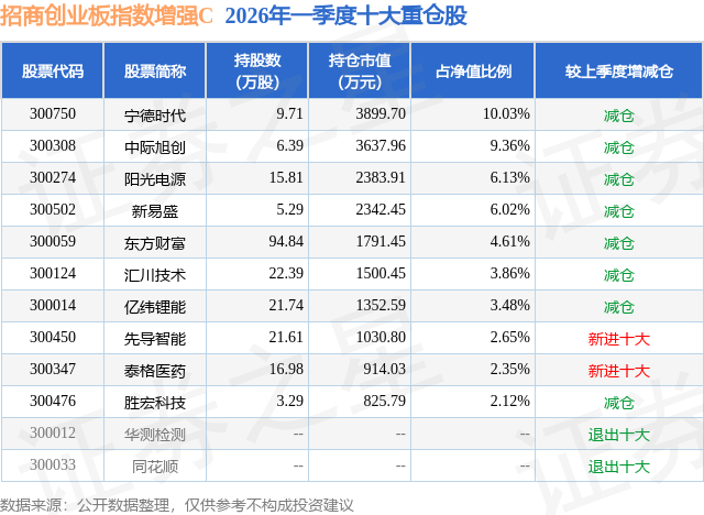 从基金规模来看,招商创业板指数增强C基金2026年一季度公布的基金规模为2.08亿元,较上一期规模8114.8万元变化了1.26亿元,环比变化了155.83%。该基金最新一期资产配置为:股票占净值比94.2%,无债券类资产,现金占净值比5.83%。从基金持仓来看,该基金当季前十大股票仓位达50.61%,第一大重仓股为宁德时代(300750),持仓占比为10.03%。