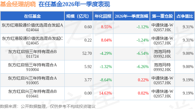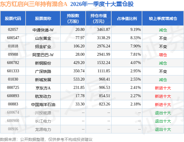 从基金规模来看,东方红启兴三年持有混合A基金2026年一季度公布的基金规模为3.77亿元,较上一期规模3.61亿元变化了1572.23万元,环比变化了4.35%。该基金最新一期资产配置为:股票占净值比80.39%,无债券类资产,现金占净值比20.16%。从基金持仓来看,该基金当季前十大股票仓位达49.66%,第一大重仓股为中通快递-W(02057),持仓占比为9.19%。