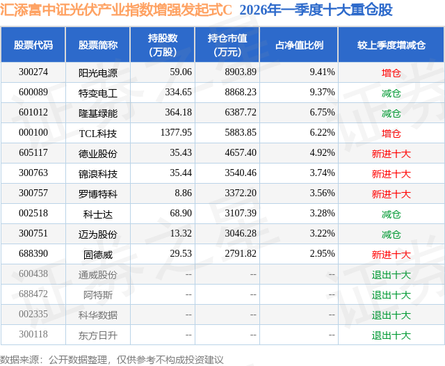 从基金规模来看,汇添富中证光伏产业指数增强发起式C基金2026年一季度公布的基金规模为6.67亿元,较上一期规模4.12亿元变化了2.54亿元,环比变化了61.66%。该基金最新一期资产配置为:股票占净值比93.36%,债券占净值比0.79%,现金占净值比5.99%。从基金持仓来看,该基金当季前十大股票仓位达53.42%,第一大重仓股为阳光电源(300274),持仓占比为9.41%。