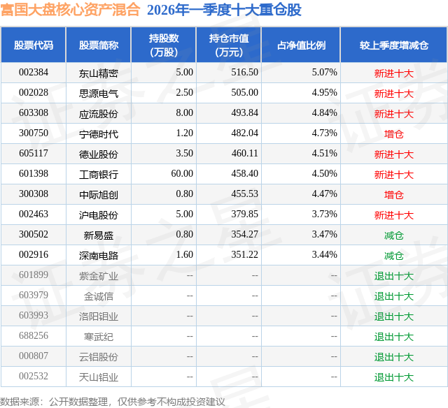 从基金规模来看,富国大盘核心资产混合基金2026年一季度公布的基金规模为1.02亿元,较上一期规模1.2亿元变化了-1769.41万元,环比变化了-14.79%。该基金最新一期资产配置为:股票占净值比80.51%,无债券类资产,现金占净值比21.29%。从基金持仓来看,该基金当季前十大股票仓位达43.71%,第一大重仓股为东山精密(002384),持仓占比为5.07%。
