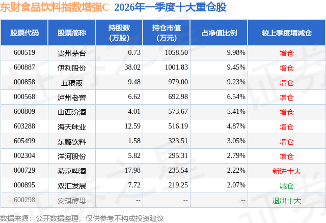 从基金规模来看,东财食品饮料指数增强C基金2026年一季度公布的基金规模为0.43亿元,较上一期规模2643.11万元变化了1655.42万元,环比变化了62.63%。该基金最新一期资产配置为:股票占净值比94.69%,无债券类资产,现金占净值比5.69%。从基金持仓来看,该基金当季前十大股票仓位达55.61%,第一大重仓股为贵州茅台(600519),持仓占比为9.98%。