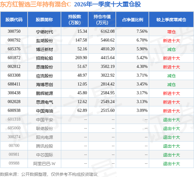 证券之星消息,日前东方红智选三年持有混合C基金公布一季报,2026年一季度最新规模0.38亿元,季度净值涨幅为7.6%。