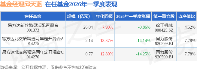 证券之星消息,日前易方达北交所精选两年定开混合A基金公布一季报,2026年一季度最新规模2.14亿元,季度净值涨幅为-14.14%。