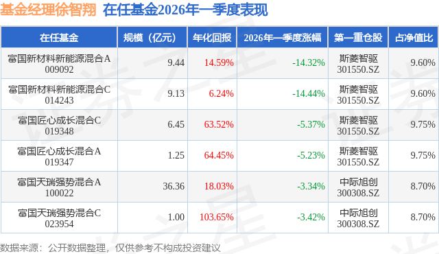 证券之星消息,日前富国新材料新能源混合C基金公布一季报,2026年一季度最新规模9.13亿元,季度净值涨幅为-14.44%。