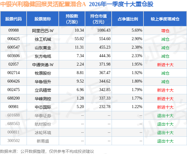 从基金规模来看,中银兴利稳健回报灵活配置混合A基金2026年一季度公布的基金规模为1.45亿元,较上一期规模1.82亿元变化了-3643.42万元,环比变化了-20.05%。该基金最新一期资产配置为:股票占净值比84.19%,债券占净值比6.9%,现金占净值比2.95%。从基金持仓来看,该基金当季前十大股票仓位达23.75%,第一大重仓股为阿里巴巴-W(09988),持仓占比为5.69%。