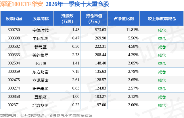 从基金规模来看,深证100ETF华安基金2026年一季度公布的基金规模为0.49亿元,较上一期规模5163.96万元变化了-305.74万元,环比变化了-5.92%。该基金最新一期资产配置为:股票占净值比96.95%,无债券类资产,现金占净值比3.16%。从基金持仓来看,该基金当季前十大股票仓位达41.43%,第一大重仓股为宁德时代(300750),持仓占比为11.81%。