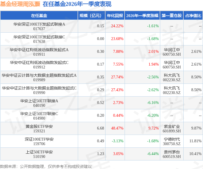 证券之星消息,日前深证100ETF华安基金公布一季报,2026年一季度最新规模0.49亿元,季度净值涨幅为-1.68%。