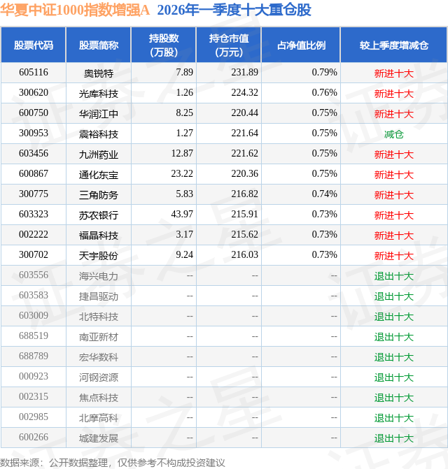 从基金规模来看,华夏中证1000指数增强A基金2026年一季度公布的基金规模为1.0亿元,较上一期规模4.26亿元变化了-3.25亿元,环比变化了-76.42%。该基金最新一期资产配置为:股票占净值比90.25%,无债券类资产,现金占净值比9.72%。从基金持仓来看,该基金当季前十大股票仓位达7.48%,第一大重仓股为奥锐特(605116),持仓占比为0.79%。