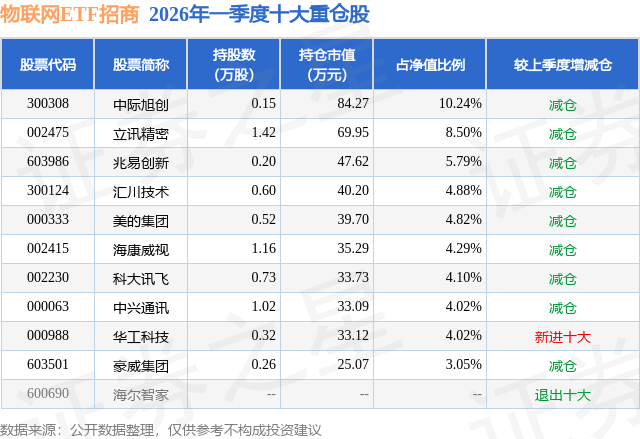 从基金规模来看,物联网ETF招商基金2026年一季度公布的基金规模为0.08亿元,较上一期规模1216.1万元变化了-392.97万元,环比变化了-32.31%。该基金最新一期资产配置为:股票占净值比98.5%,无债券类资产,现金占净值比1.4%。从基金持仓来看,该基金当季前十大股票仓位达53.71%,第一大重仓股为中际旭创(300308),持仓占比为10.24%。