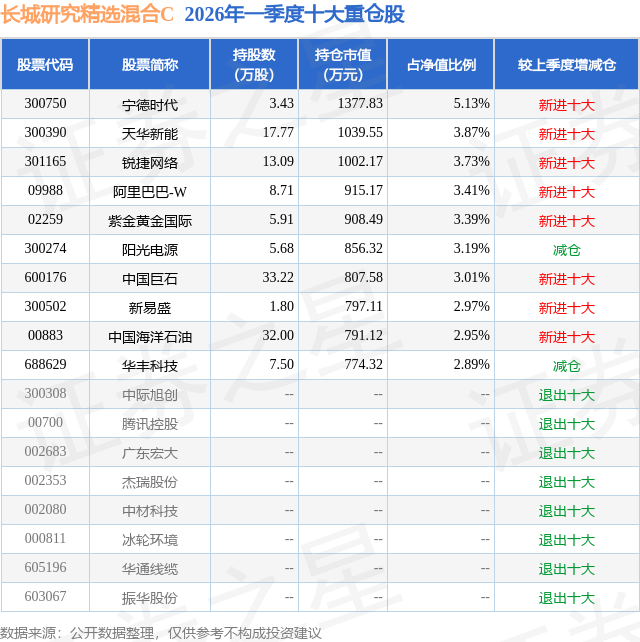 从基金规模来看,长城研究精选混合C基金2026年一季度公布的基金规模为0.02亿元,较上一期规模14.73万元变化了149.26万元,环比变化了1013.25%。该基金最新一期资产配置为:股票占净值比80.46%,无债券类资产,现金占净值比25.04%。从基金持仓来看,该基金当季前十大股票仓位达34.54%,第一大重仓股为宁德时代(300750),持仓占比为5.13%。