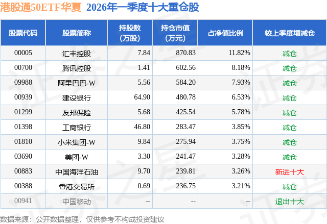 从基金规模来看,港股通50ETF华夏基金2026年一季度公布的基金规模为0.74亿元,较上一期规模8073.89万元变化了-708.73万元,环比变化了-8.78%。该基金最新一期资产配置为:股票占净值比97.96%,无债券类资产,现金占净值比1.92%。从基金持仓来看,该基金当季前十大股票仓位达57.59%,第一大重仓股为汇丰控股(00005),持仓占比为11.82%。