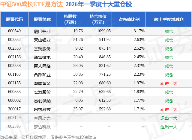 从基金规模来看,中证500成长ETF易方达基金2026年一季度公布的基金规模为3.46亿元,较上一期规模3.53亿元变化了-649.96万元,环比变化了-1.84%。该基金最新一期资产配置为:股票占净值比95.55%,无债券类资产,现金占净值比4.26%。从基金持仓来看,该基金当季前十大股票仓位达22.65%,第一大重仓股为厦门钨业(600549),持仓占比为3.17%。