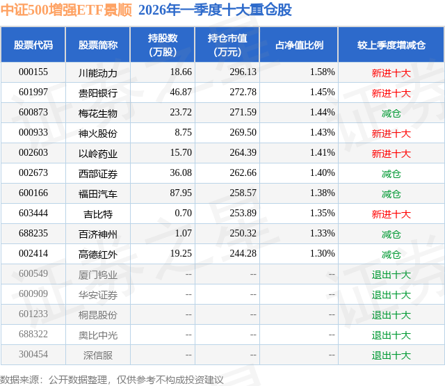 从基金规模来看,中证500增强ETF景顺基金2026年一季度公布的基金规模为1.88亿元,较上一期规模2.32亿元变化了-4361.67万元,环比变化了-18.83%。该基金最新一期资产配置为:股票占净值比98.23%,无债券类资产,现金占净值比2.06%。从基金持仓来看,该基金当季前十大股票仓位达14.07%,第一大重仓股为川能动力(000155),持仓占比为1.58%。