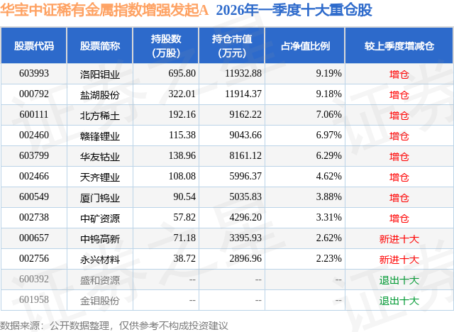 从基金规模来看,华宝中证稀有金属指数增强发起A基金2026年一季度公布的基金规模为3.1亿元,较上一期规模3892.69万元变化了2.71亿元,环比变化了695.22%。该基金最新一期资产配置为:股票占净值比94.62%,债券占净值比5.09%,现金占净值比2.3%。从基金持仓来看,该基金当季前十大股票仓位达55.35%,第一大重仓股为洛阳钼业(603993),持仓占比为9.19%。