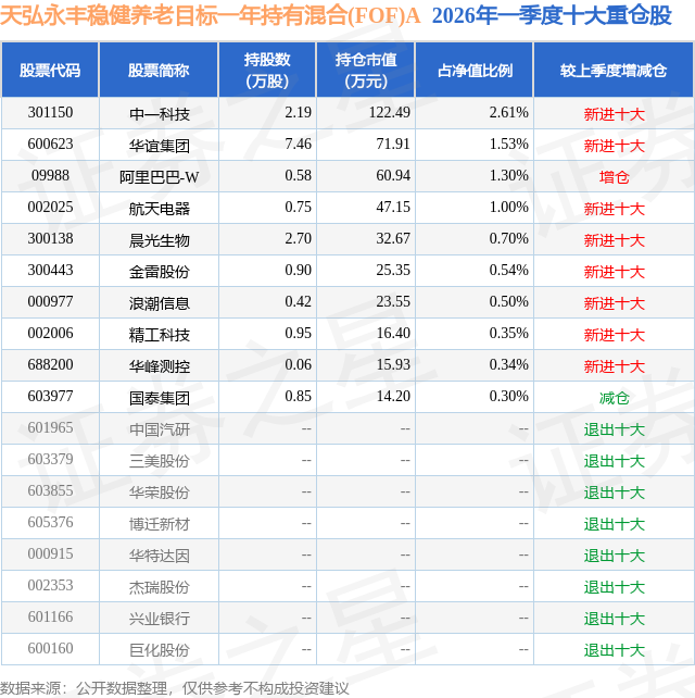 从基金规模来看,天弘永丰稳健养老目标一年持有混合(FOF)A基金2026年一季度公布的基金规模为0.32亿元,较上一期规模8589.78万元变化了-5406.34万元,环比变化了-62.94%。该基金最新一期资产配置为:股票占净值比10.28%,债券占净值比4.75%,现金占净值比3.32%。从基金持仓来看,该基金当季前十大股票仓位达9.17%,第一大重仓股为中一科技(301150),持仓占比为2.61%。
